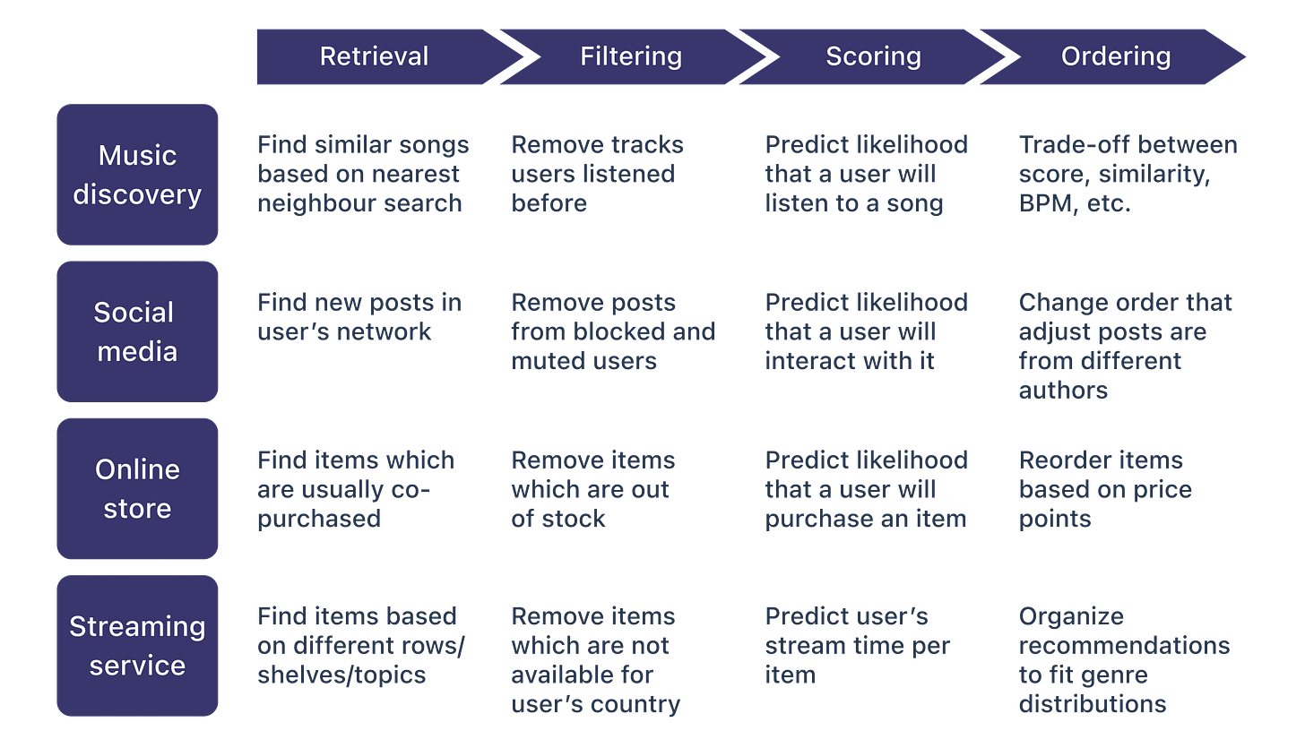 1. Retrieval stage: retrieves the candidate items that are ranked for the user. For the majority of our use-cases we use a light-weight collaborative filter model which learns from your users interactions to find the top most relevant items for each user.